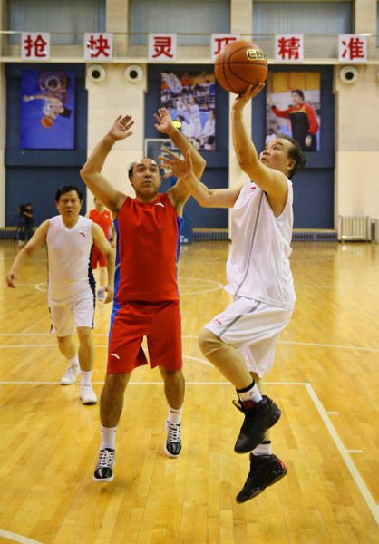 10月3日晚,在全国人民欢度中秋、国庆佳节之际,国家体育总局训练局篮球馆里人声鼎沸,墙壁上“我运动、我健康、我参与、我快乐”的横幅格外醒目。现场不管是白发苍苍的老人,还是朝气蓬勃的年轻人都在为自己支持的球队加油鼓劲,一场别开生面的篮球友谊赛正在这里进行。这场比赛是退役篮球运动员和东城区篮球爱好者混合编队、共同参与的一次全民健身活动。同时,今天的比赛场上还来了一位重要的参赛者——温家宝总理。
