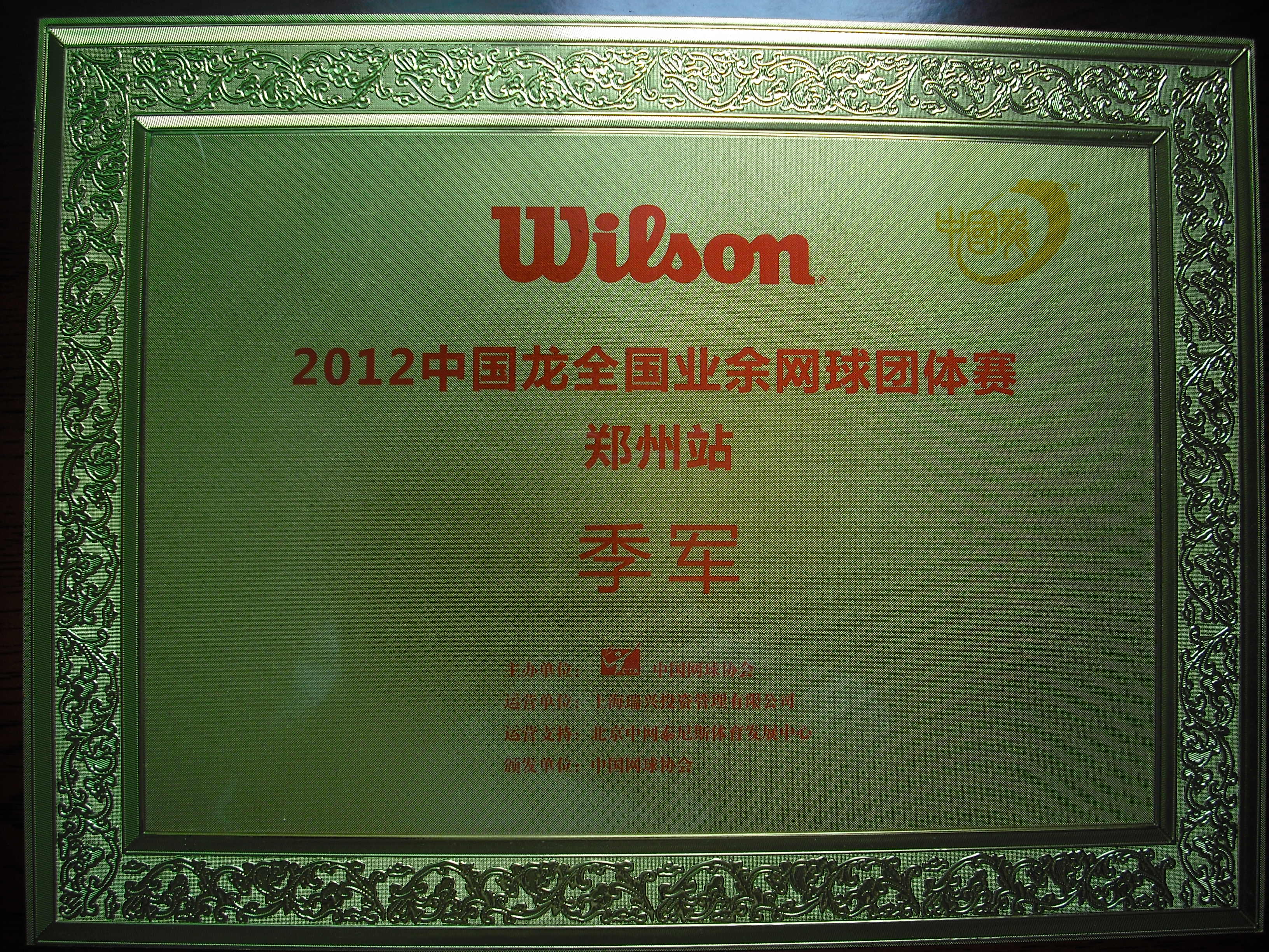 2012年获全国业余网球团体赛郑州站季军