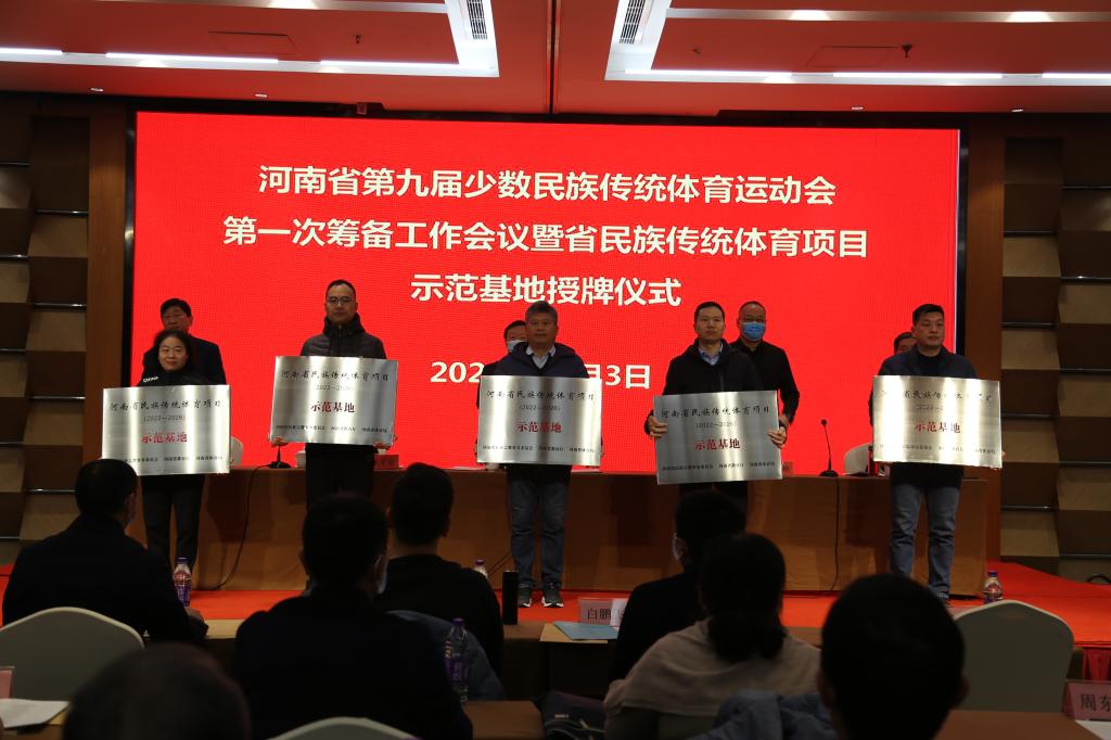12月3日上午,河南省民族传统体育项目示范基地授牌仪式在郑州佳田国际酒店举行,省民宗委副主任郭瑞疆、省体育局群体处处长赵峻以及各省辖市民宗局分管民族工作副局长、体育局副局长、省民族传统体育项目示范基地单位有关负责人参加会议。会议由省民宗委民族一处处长陈正论主持。