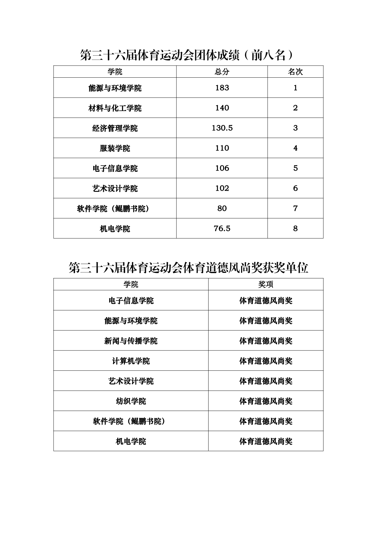 第三十六届体育运动会团体成绩(前八名)及体育道德风尚奖获奖单位