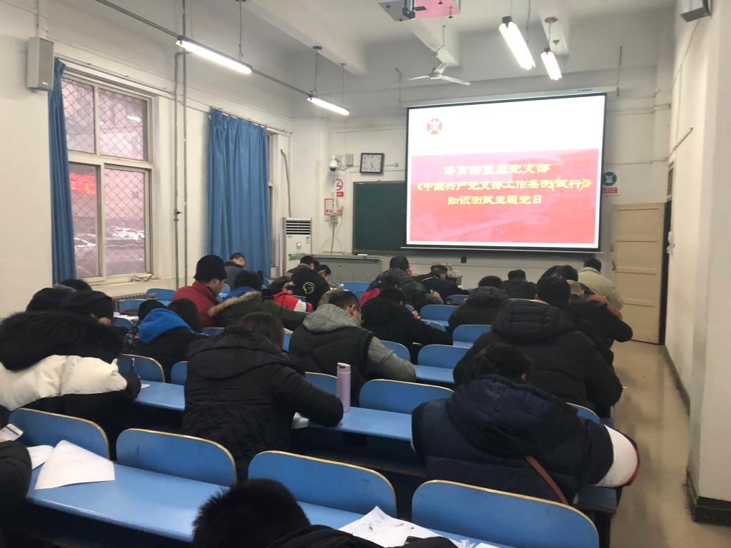 为深入学习贯彻《中国共产党支部工作条例(试行)》(以下简称《条例》),增强支部党员党性修养,2019年1月14日下午在西区主教楼112组织开展《中国共产党支部工作条例(试行)》知识测试主题党日活动。