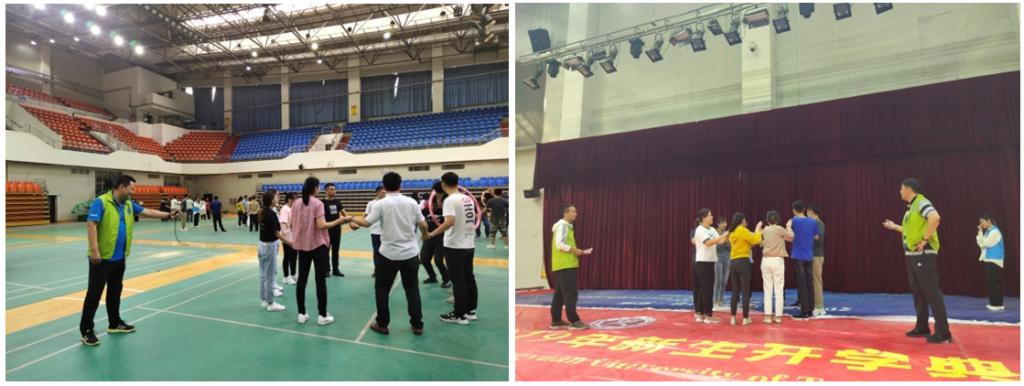 本次新教工拓展培训主要内容包括破冰游戏、团队组建、老师说、疯狂市场、闯三关、盲人方阵、闭营等,其中以团队项目为主。