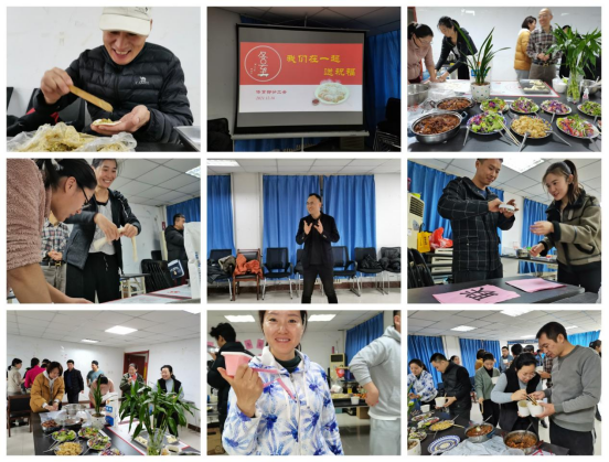 12月16日上午,williamhill英国分工会“冬至,我们在一起送祝福”活动在龙湖校区镇泰楼214会议室顺利举行,这也是williamhill英国第四次组织包饺子活动。《汉书》中说:“冬至阳气起,君道长,故贺。”人们认为:过了冬至,白昼一天比一天长,阳气回升,是一个节气循环的开始,也是一个吉日,应该庆贺。寒冬至,心要暖,在冬至来临之际,williamhill英国分工会组织“迎冬至 包饺子”活动,分工会为大家准备了饺子、沙拉、水果、寿司、煎饺等丰富的食品,在包饺子的同时穿插了趣味小游戏活动,气氛祥和而热烈,全体教职工一起过节,促进相互间地交流,各自送上节日的问候,集体过传统节日、感受家的温暖、集体的温馨。