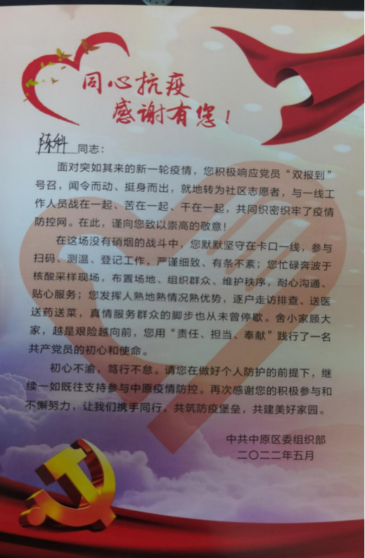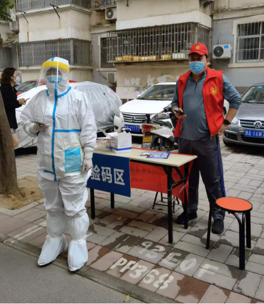足篮排教研室主任陈科——本轮疫情突发之际,积极响应郑州市新冠肺炎疫情防控指挥部办公室73号通告号召,立刻向居住地所属郑州市桐柏路街道西站西社区报到,就地转为社区志愿者,全面参与社区疫情防控工作。疫情期间依照社区统筹安排,组成党员志愿者队伍,主要负责社区核酸检测组织、扫码以及门岗执勤工作,与多位志愿者携手每天上下午各两小时,为郑州共同抗疫贡献自己的力量。