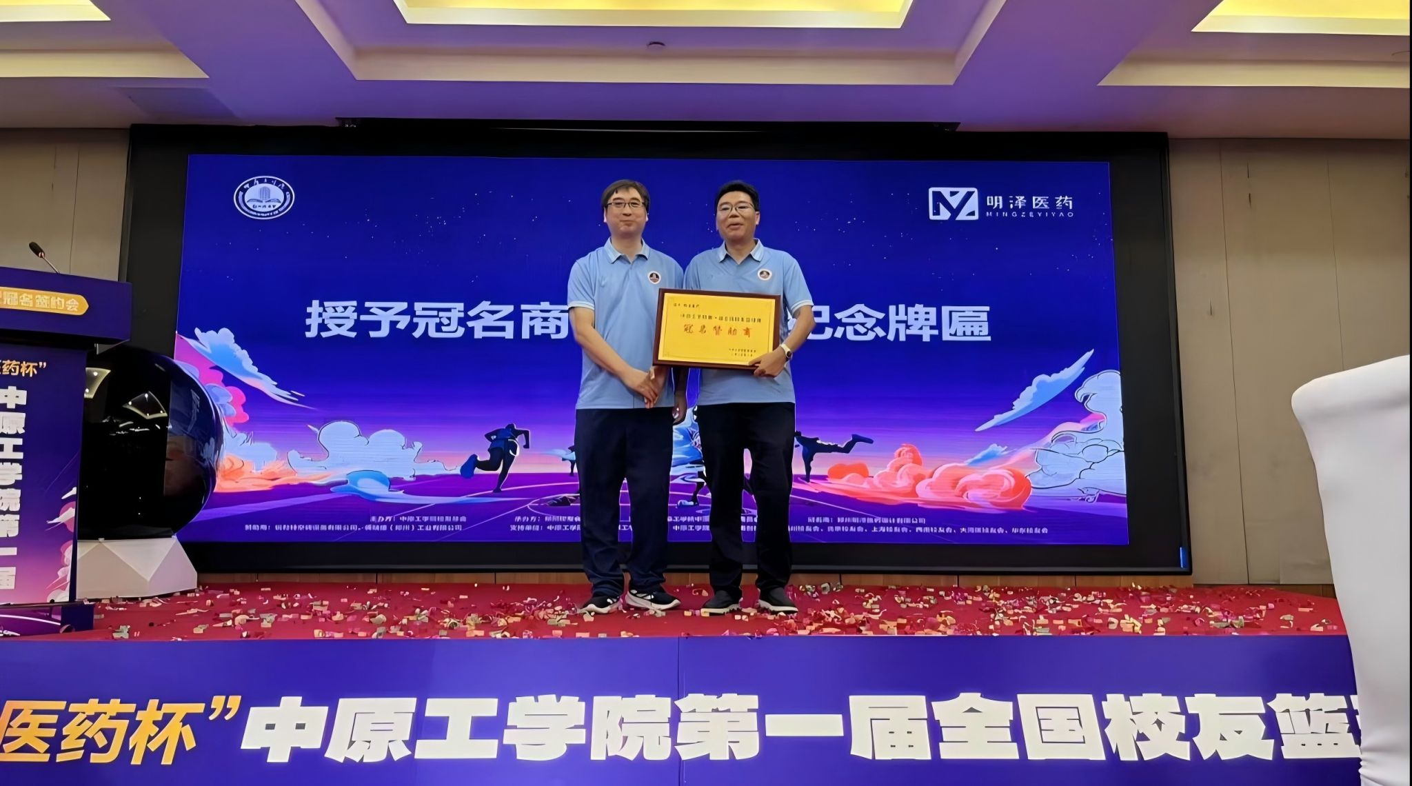 郑州校友会会长王现伟代表赛事承办方发言,表达对赛事成功举办的坚定信心。明泽医药总经理徐贡杰与郑州校友会秘书长蓝宏良代表双方签署冠名合作协议。