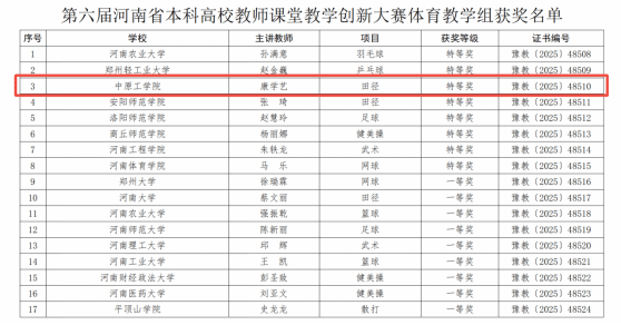 近日,第六届河南省本科高校教师课堂教学创新大赛(体育教学组)获奖名单正式公布。williamhill英国康学艺老师凭借精妙的课堂设计、扎实的教学技能和突出的身体素质,从众多参赛教师中脱颖而出,荣获大赛特等奖。