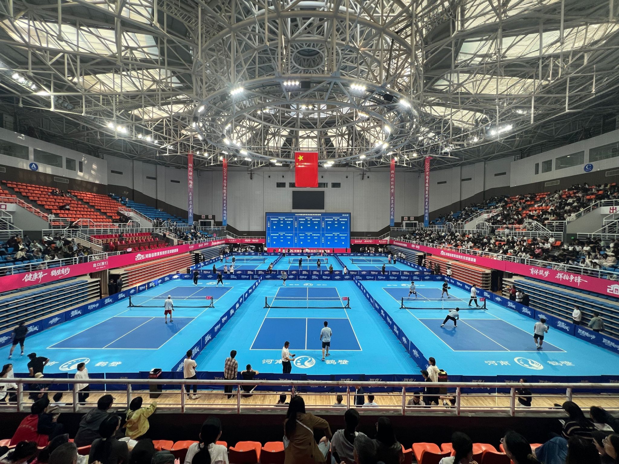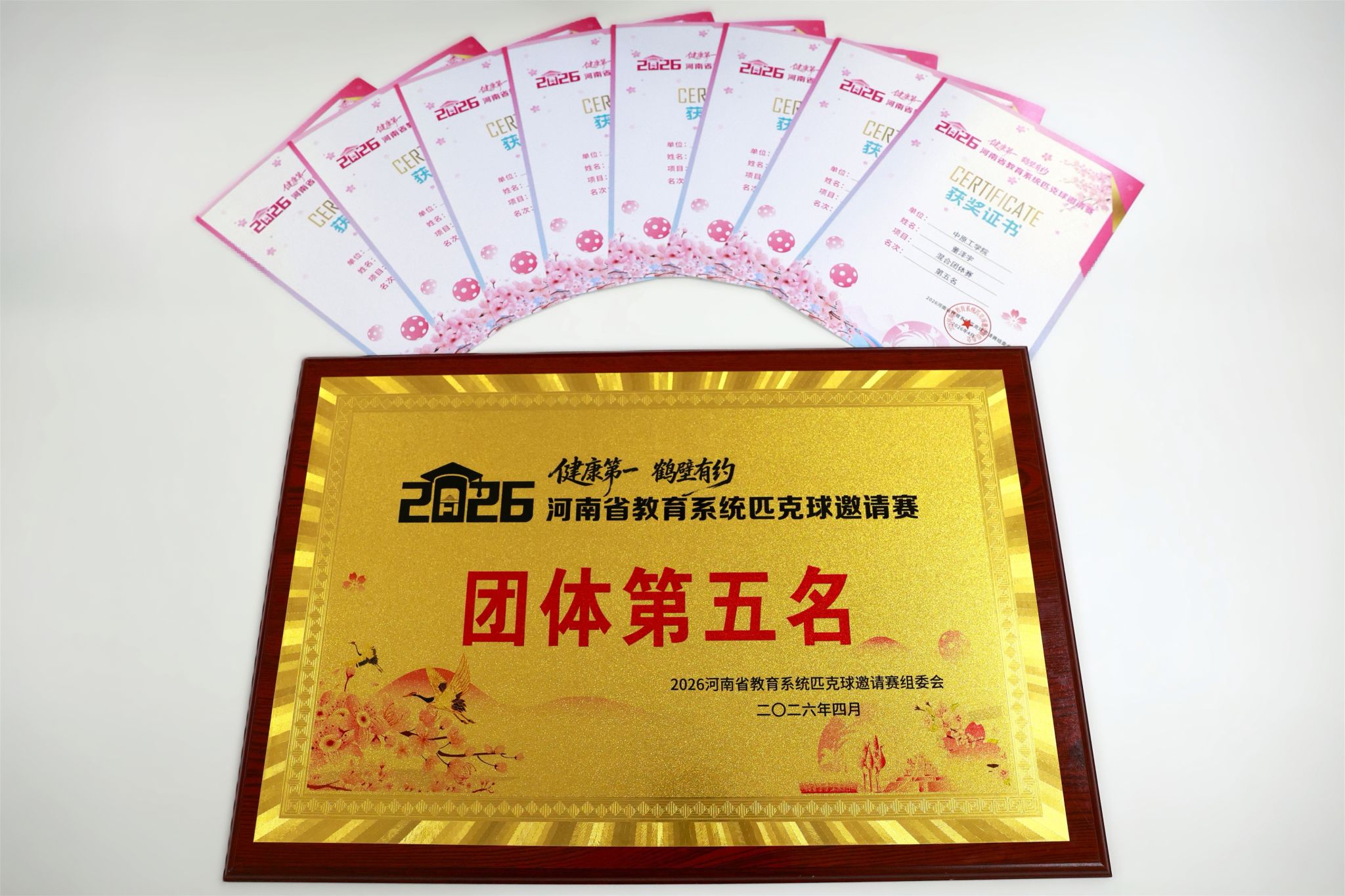 4月18日至19日,2026年河南省教育系统匹克球邀请赛在鹤壁市千鹤之舞体育馆举行。本次比赛由河南省教育厅主办,鹤壁市教育体育局、鹤壁市匹克球发展促进中心承办,共吸引来自全省各省辖市、济源示范区、航空港区教育行政部门及各高等学校的51支代表队、502名运动员同场竞技。我校代表队团结协作、奋勇争先,最终荣获团体第5名。