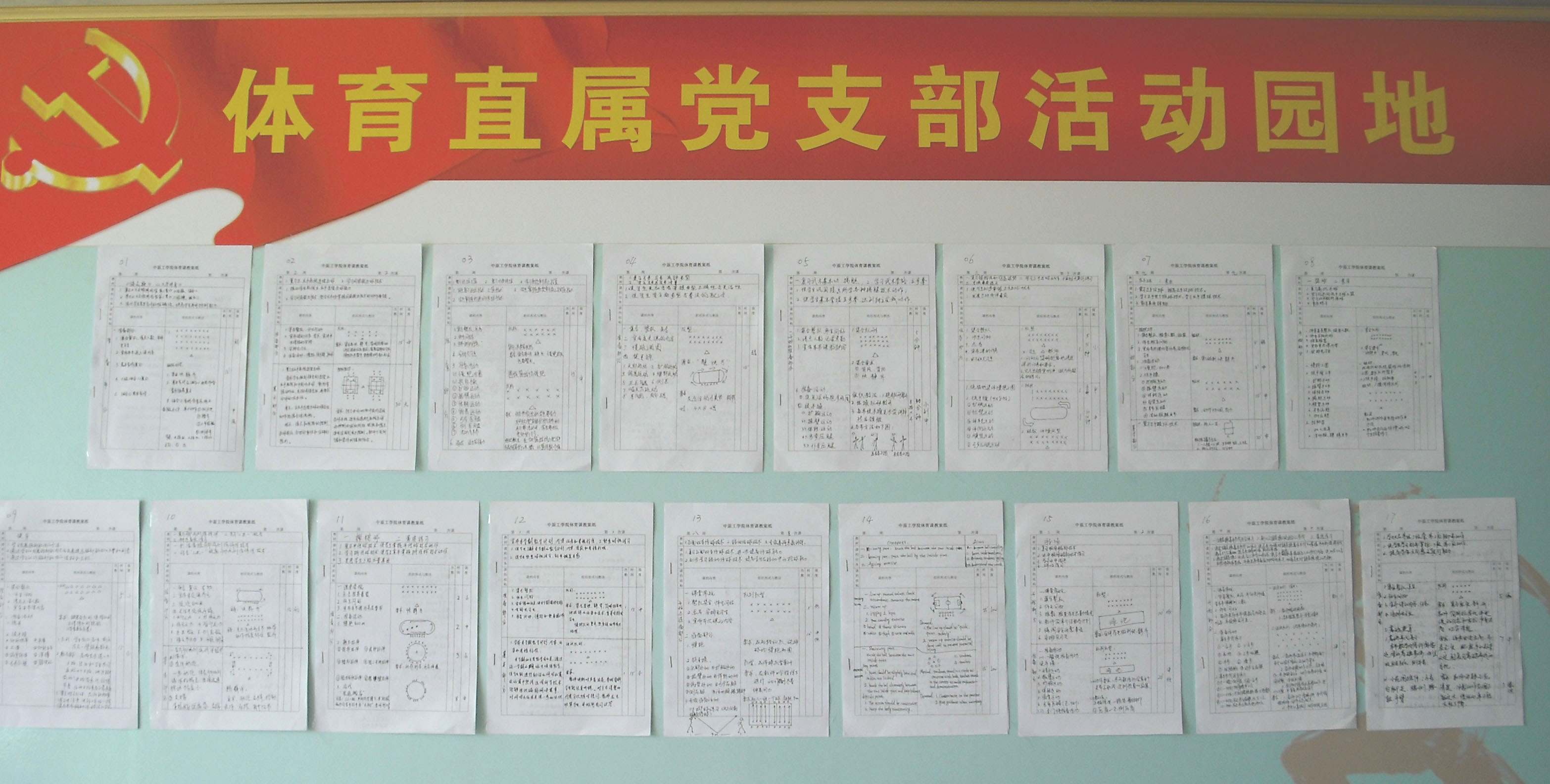 为加强党支部建设,提高党员党性修养,增强组织纪律观念,树立党员教师先锋模范带头作用,日前体育直属党支部举办了党日活动——暨教案现场设计展评。活动中,根据体育课的规范和要求,党员在专用教案纸上,现场设计手写教案。为保证活动客观、公正,活动采用了匿名盲评的方式,并对外公开展出,让部内外师生参观交流。按照要求,全体党员参加了活动,无一人请假。通过此次活动,党员队伍经历了一次精神洗礼,党组织凝聚力和战斗力得到增强。